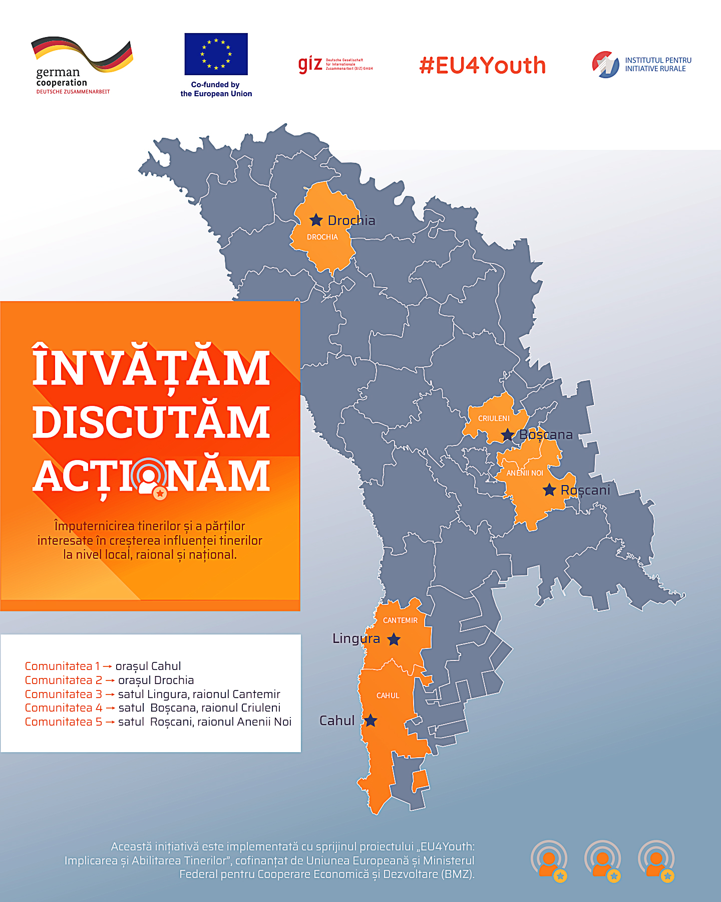Forumul a fost organizat în cadrul proiectului „Învățăm. Discutăm. Acționăm: împuternicirea tinerilor și a părților interesate în creșterea influenței tinerilor la nivel local, raional și național”, implementat de Institutul pentru Inițiative Rurale (iRi), cu sprijinul proiectului „EU4Youth: Implicarea și Abilitarea Tinerilor”, cofinanțat de Uniunea Europeană și Ministerul Federal pentru Cooperare Economică și Dezvoltare (BMZ).