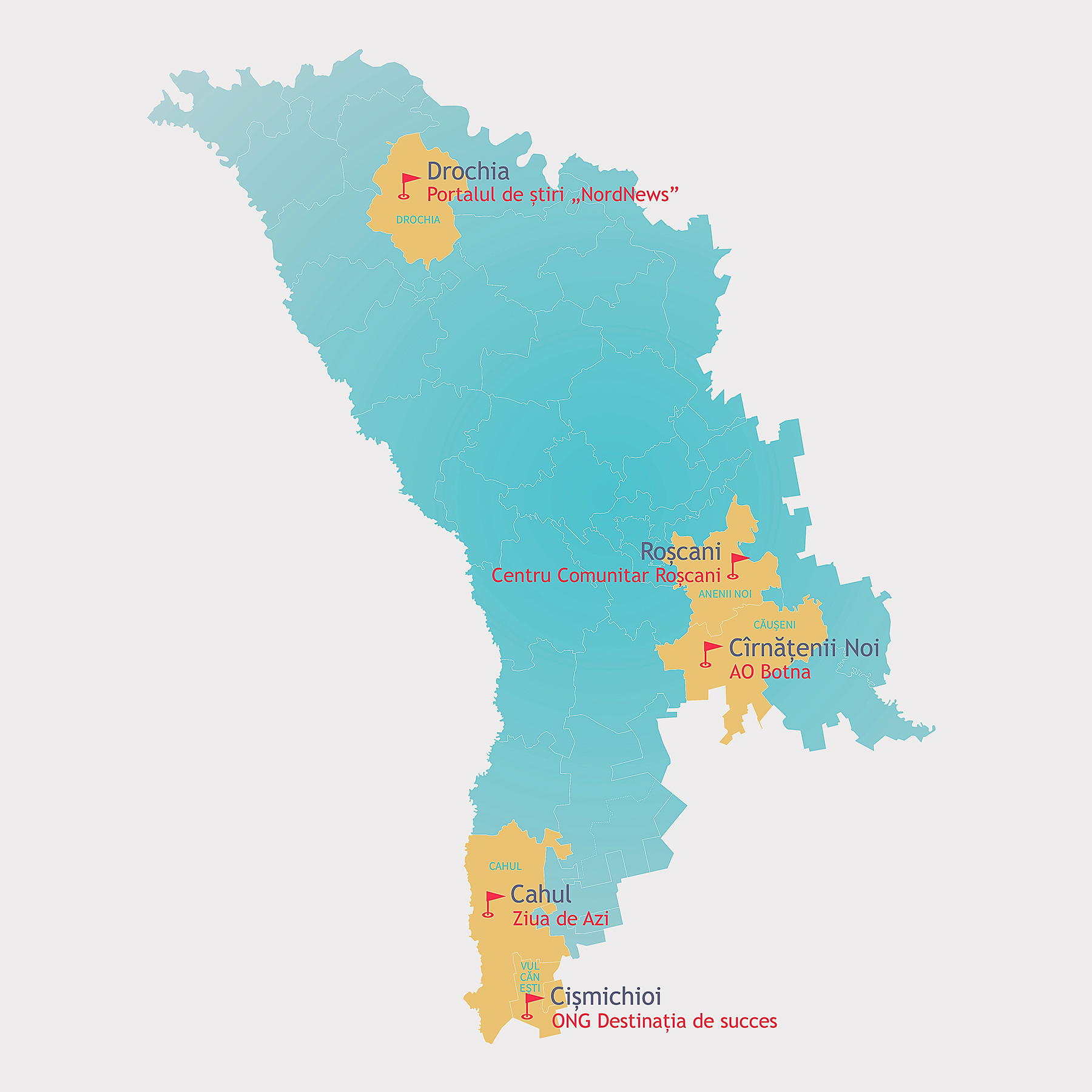 Trei ONG-uri locale – „Destinatia de succes” din Cismichioi, „AO Botna” din Cîrnățenii Noi și „Centru Comunitar Roșcani” din Roșcani – și două instituții media independente: portalul Ziua de Azi, or. Cahul și NordNews, or. Drochia.